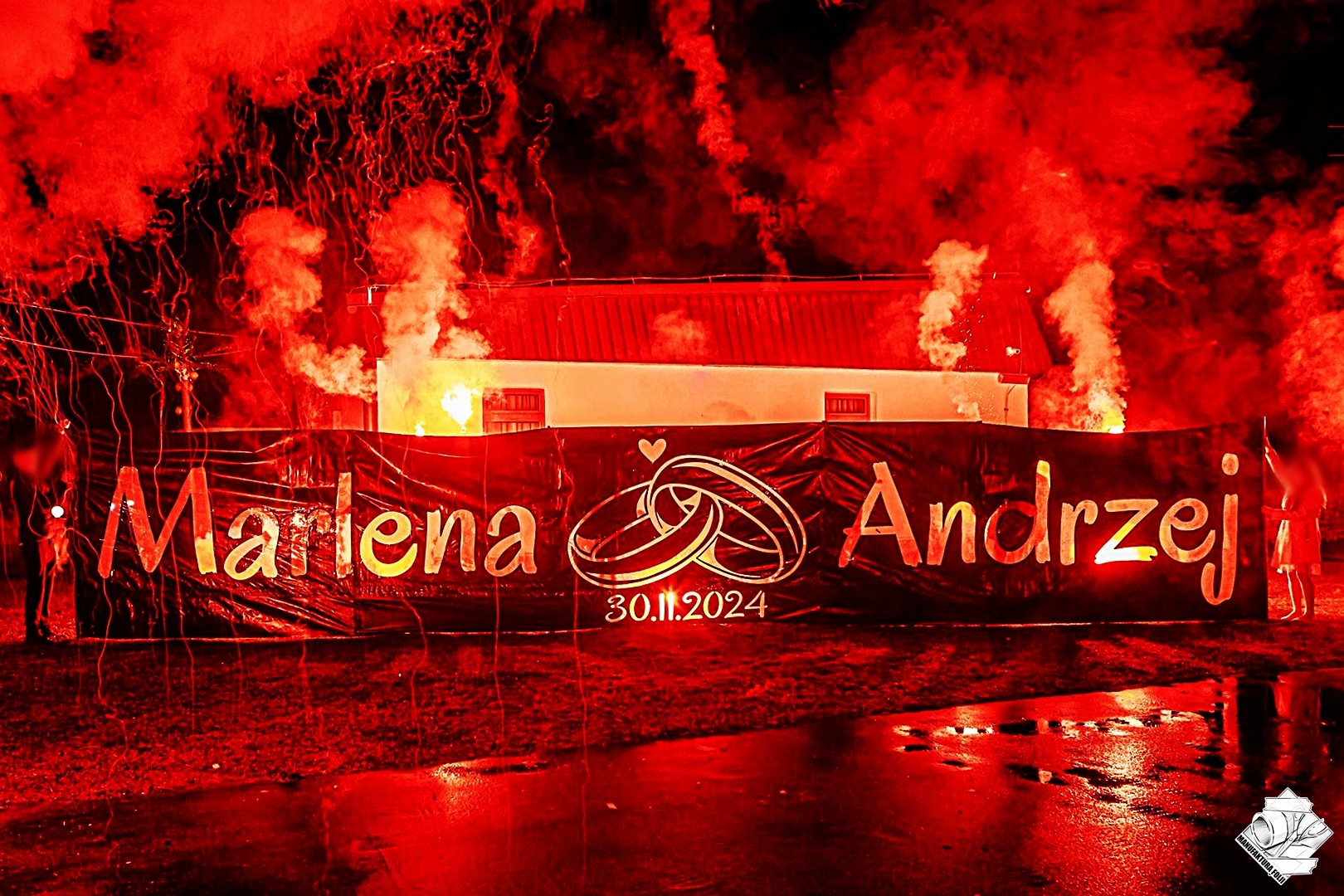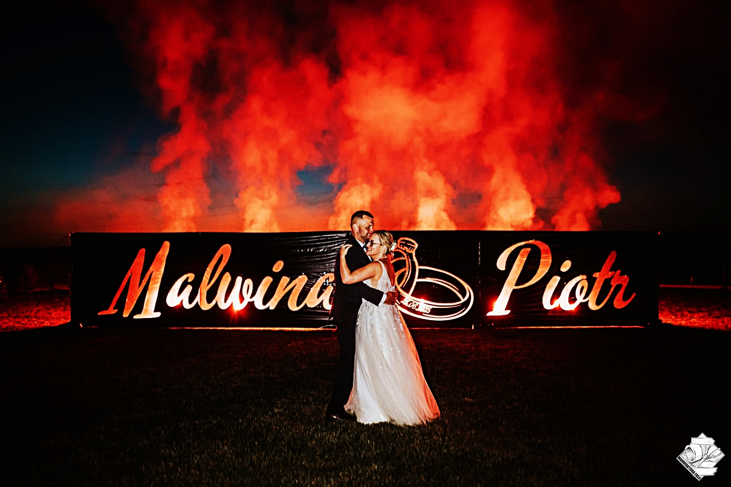 Folia podświetlana pirotechniką (2m x 10m) jako wyznanie miłości na weselu - Brzeg Dolny.